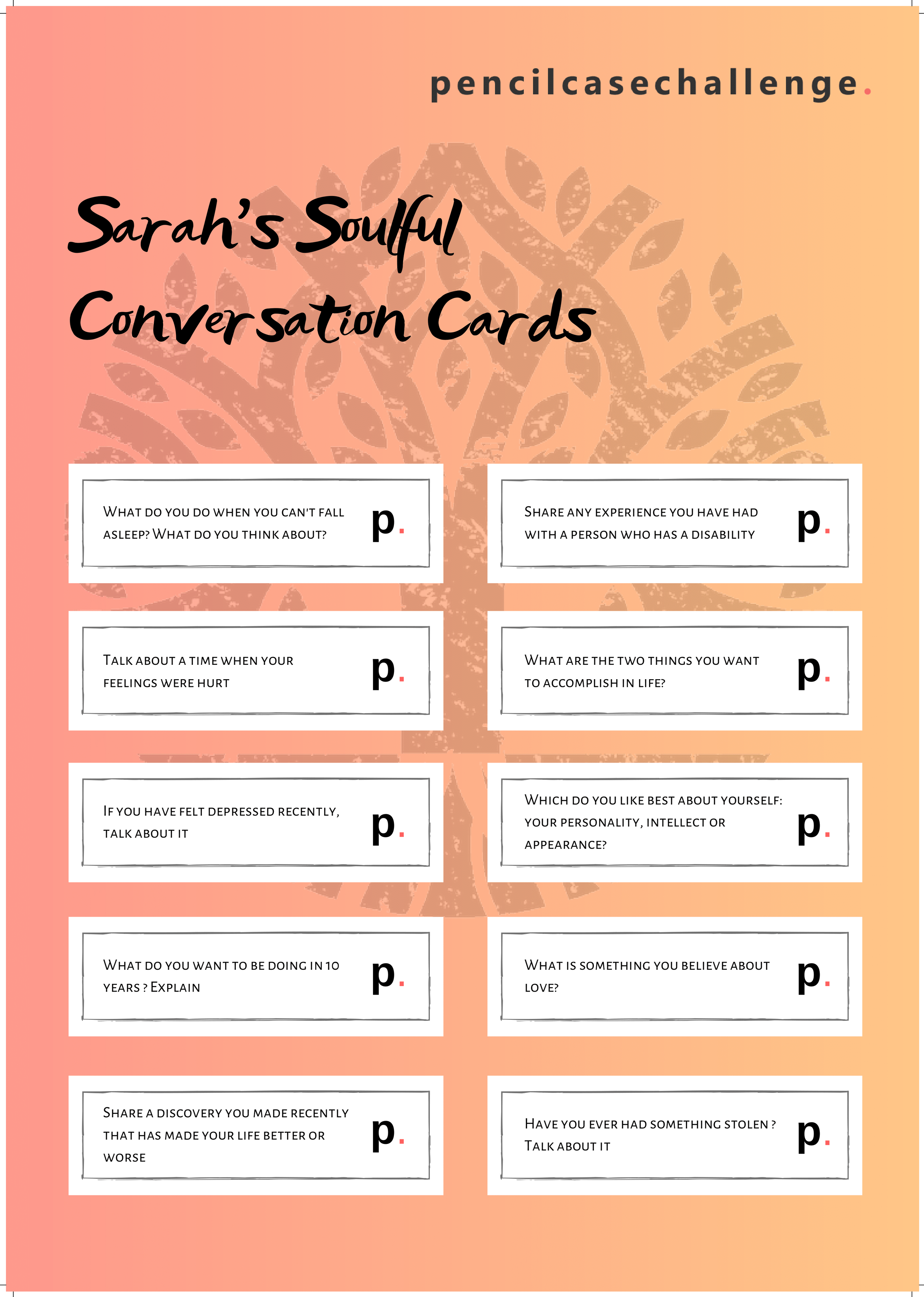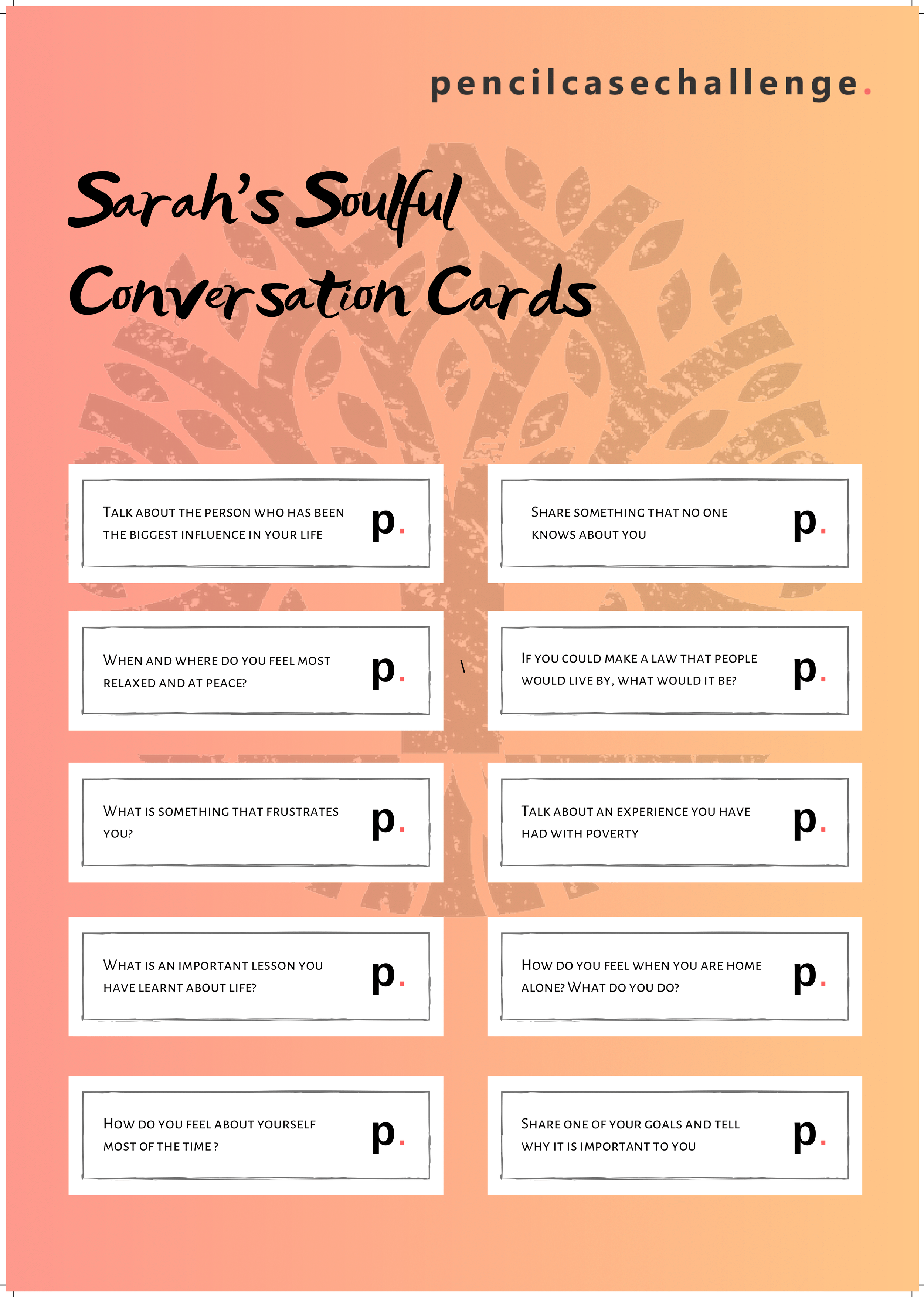 Click on the images below to download your own copy of Sarah’s Soulful Conversation Cards (Right click on image and ‘Save As’ to download)